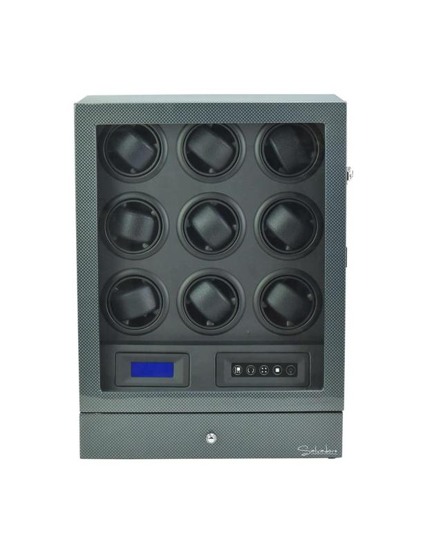Шкатулка для автоподзавода 9-ти часов. Дополнительное отделение для неподвижного хранения 2х часов Материал корпуса - дерево, с имитацией карбона. Цвет - серый. Интерьер - PU кожа черного цвета. Сенсорное управление. LED подсветка. Автостоп при открытии дверцы. Управление с пульта ДУ. Производитель - компания Salvadore, Австрия. Размеры: 33х19х45 см