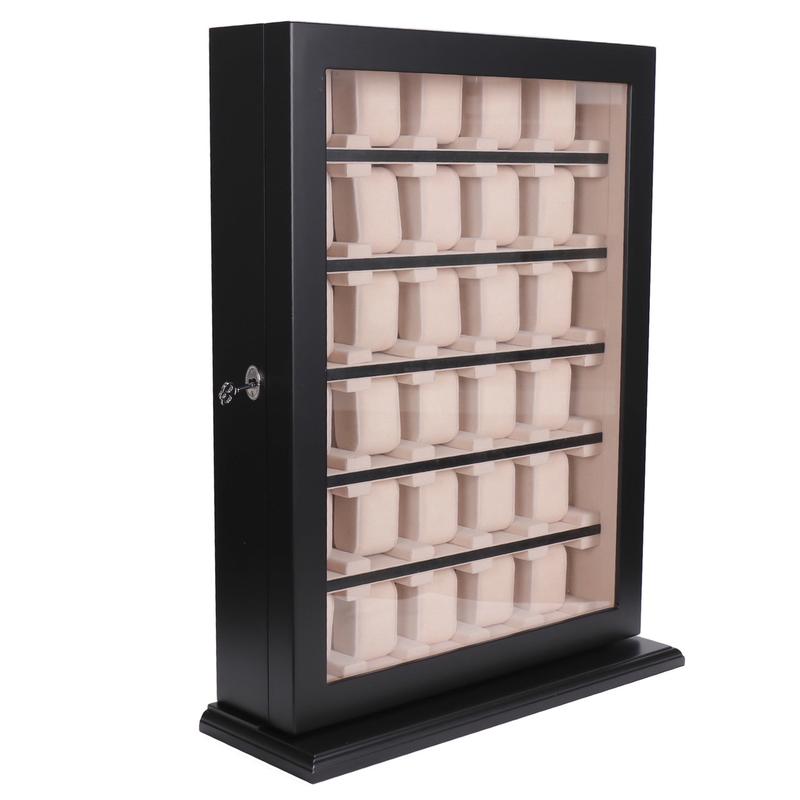 Шкатулка для нерухомого зберігання 30-ти годинників. Матеріал корпусу - дерево. Колір - чорний, матовий лак. Інтер'єр - оксамит світлого кольору. Виробник - компанія Salvadore, Австрія. Розміри шкатулки: 43,5х15х20 см Є можливість кріплення на стіну.