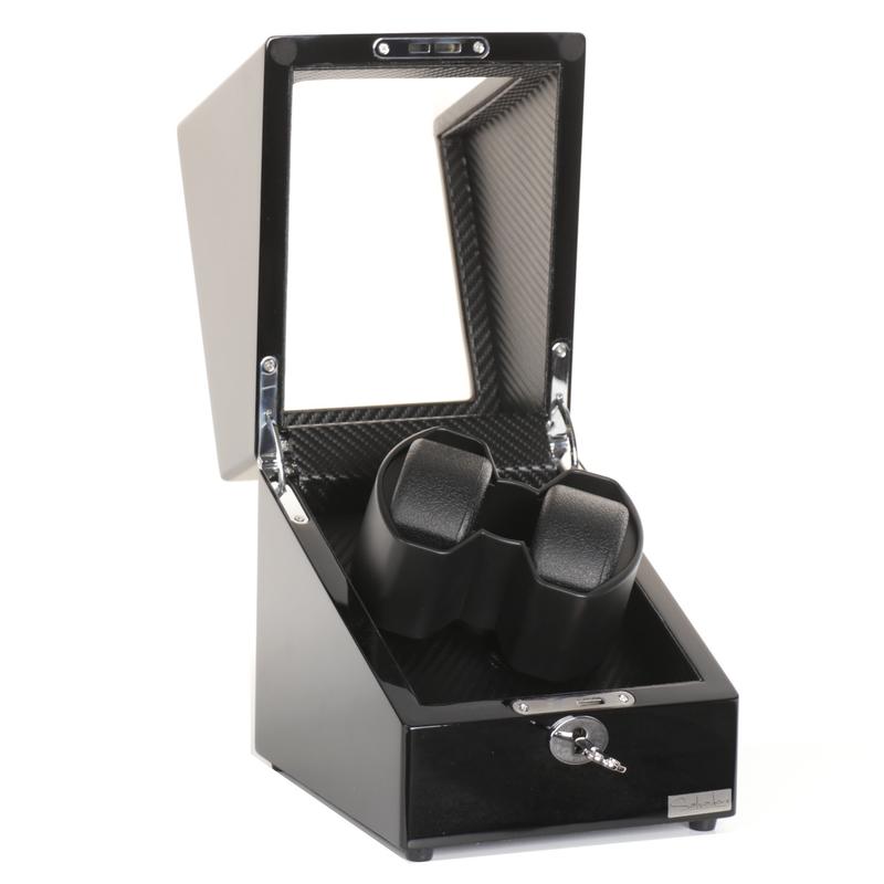 Скринька для підзаводу двох годинників. Матеріал корпусу - дерево, вкрите лаком. Колір - чорний. Інтер'єр - PU шкіра з тисненням під карбон. Механічне управління, 9 програм. Замок. Автостоп. Можливість роботи від батарейки типа D. Виробник - компанія Salvadore, Австрія. Розміри: 15,5х17х19 см