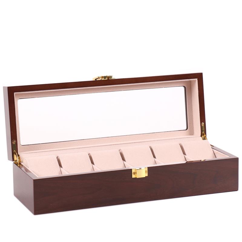 Шкатулка для зберігання 6-ти годинників. Матеріал корпусу - дерево. Колір - коричневий. Інтер'єр - світлий оксамит. Розмір шкатулки: 312х118х85мм Виробник - компанія Craft, Тайвань.