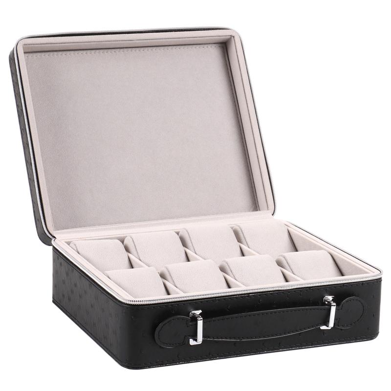 Шкатулка для транспортування/зберігання 8-ми годинників. Матеріал корпусу - PU шкіра. Колір - чорний. Інтер'єр - світлий оксамит. Виробник - Craft, Taiwan. Ширина ячейки 5,5 см. Розміри шкатулки: 258х220х95мм
