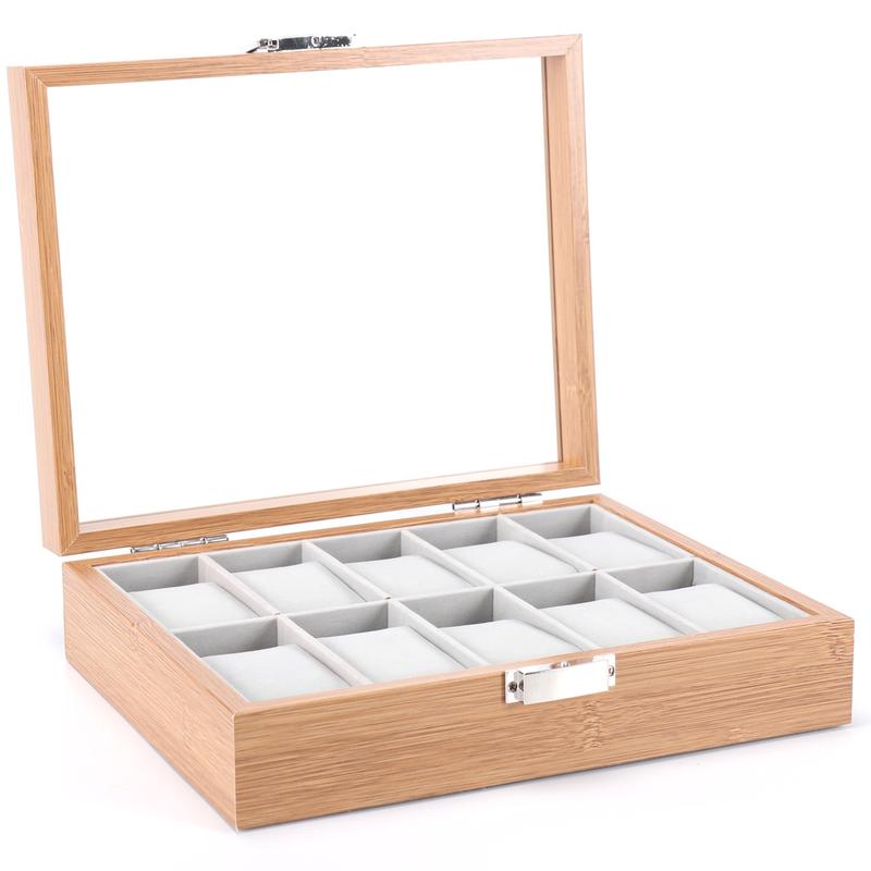 Шкатулка для зберігання 10-ти годинників. Матеріал корпусу - MDF, скло. Колір - світло-коричневий. Інтер’єр - оксамит сірого кольору. Виробник - компанія Craft, Тайвань. Розміри шкатулки: довжина 26 см ширина 21 см висота 7 см