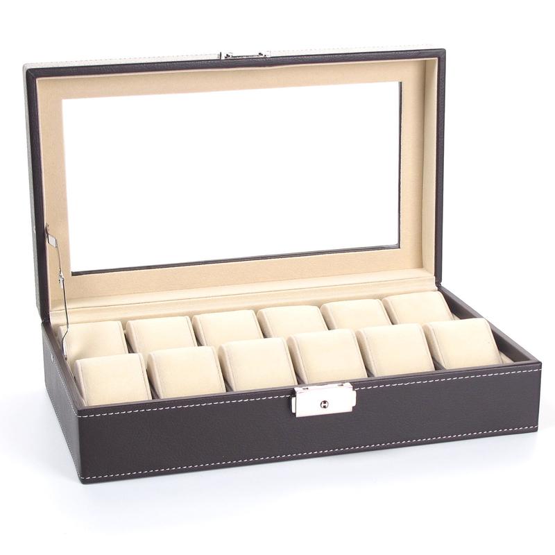 Шкатулка для нерухомого зберігання 12-ти годинників. Матеріал корпусу - PU шкіра. Колір - темно-коричневий. Інтер’єр - оксамит світлого кольору. Виробник - компанія Salvadore, Австрія. Розміри: 32,8х19,5х8,5 см