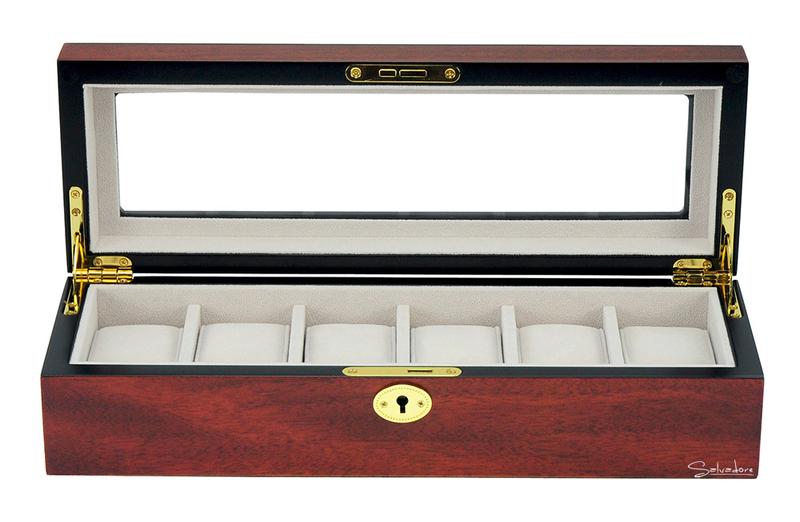 Шкатулка для нерухомого зберігання 6-ти годинників. Матеріал корпусу - дерево, МДФ. Колір - коричневий, матове покриття. Інтер’єр - оксамит світлого кольору. Виробник - компанія Salvadore, Австрія. Розміри: 34,3х11,7х8,5 см