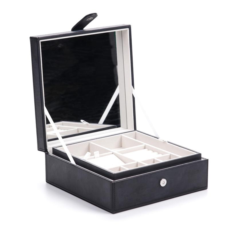 Скринька для зберігання прикрас Матеріал корпусу - PU шкіра Колір - чорний. Інтер'єр - світлий оксамит. Виробник - компанія Salvadore, Австрія. Розміри: 218х218х88мм