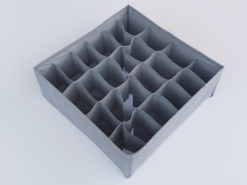 Органайзер для зберігання спідньої білизни, шкарпеток та іншої дрібниці темно- сірого кольору, розмір 32*32*12 см, на 24 відділень. Органайзер виготовлений із щільного флізеліну - дихаючої тканини і картону. Якщо вам знадобиться його скласти, це дуже легко зробити, у складеному вигляді органайзер займає мало місця. Завдяки органайзеру ваші речі завжди у вас під рукою. Органайзер також буде чудовим подарунком для людини, яка любить облаштовувати свій будинок. Замовлення через кошик можна зробити цілодобово.
