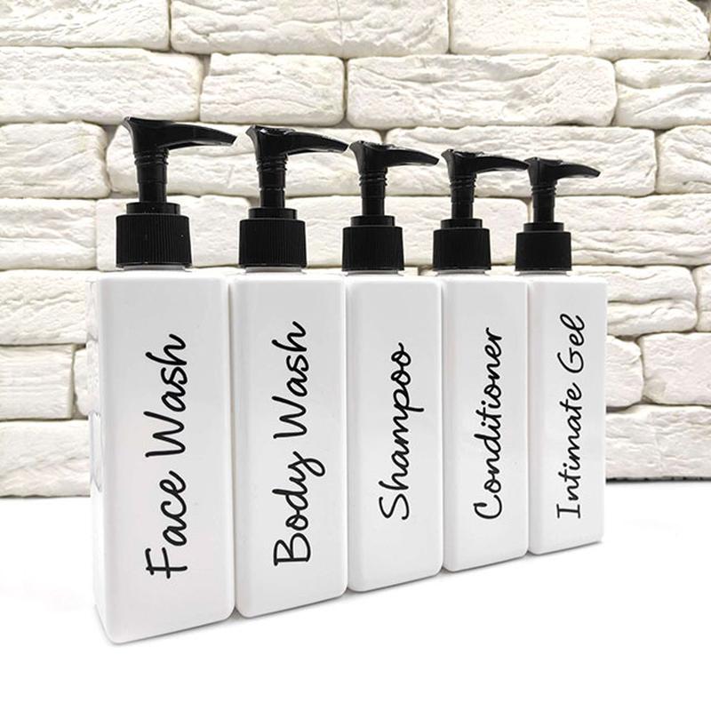 Набір складається з 5-ти білих пластикових пляшечок із дозатором чорного кольору, призначених для: -шампуню, -гелю для душу, -кондиціонера, -гелю для інтимної гігієни, -засобу для вмивання. Висота із дозатором: 18,5 см. Об'єм пляшки: 250 мл. Форма дна: квадрат. Матеріал: пластик. Не знайшли потрібний надпис? Просто напишіть нам і ми втілимо Ваше побажання у життя.