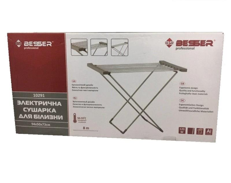 Електросушарка для білизни плитка розкладне Besser Електрична сушарка для білизни Besser призначена для швидкої і ефективної сушки білизни і одягу. Струм нагріває струни ― і білизна висушується на порядок швидше. Електросушарка Besser стане незамінним помічником при вологій погоді або в холодний зимовий період. Мобільна і стійка конструкція сушарки забезпечує компактність і безпеку її використання. Сушарка ідеальна для маленьких приміщень, тому що її можна скласти. Незамінна для швидкої сушки делікатної білизни. Ефективно бореться з бактеріями - за рахунок рівномірного розподілення тепла при сушінні білизни гинуть всі шкідливі бактерії. Ніжки оснащені пластмасовими ковпачками, що захищають підлогу від подряпин. Характеристики: - Тип: на підлозі електросушарка розкладне - Кількість прутів: 8 - Кількість режимів: 1 - Потужність: 120W - Температура нагріву: 50-55 градусів - Клас захисту: ІІ - Живлення: від мережі 220V - Максимальна вага: 15 кг - Вага: 4,5 кг - Розмір в розкладеному вигляді: 94 x 50 x 73 см - Замінює 8 м білизняний мотузки