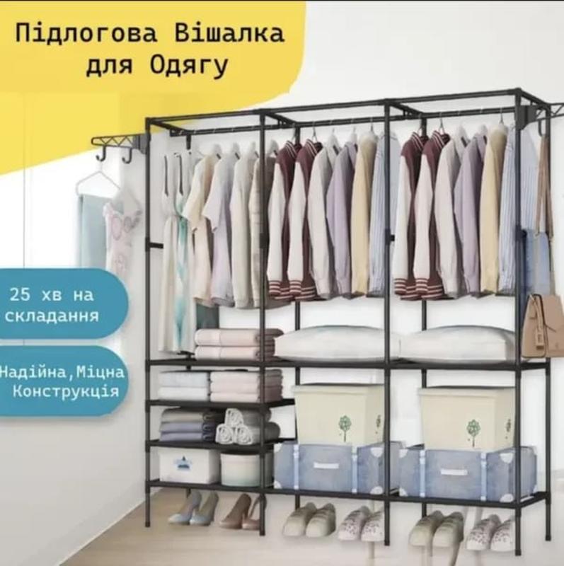 Вішалка підлогова з полицями для одягу Особливості: Тип: стійка для підлоги; Матеріал: нержавіюча сталь, пластик, водонепроникна тканина; Тип конструкції: складаний; Навантаження: до 15 кг; Колір чорний; Розміри: 173х108х45 см; Вага: 2,8 кг. Комплектація: Стійка для одягу Заводська упаковка.