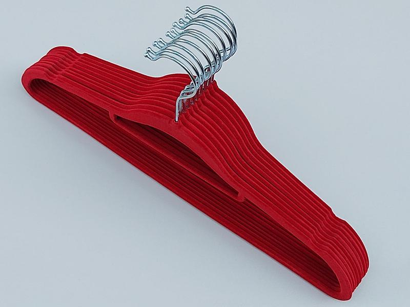 Плічка флоковані (оксамитові, велюрові), червоного кольору, довжина 41,5 см, ширина плеча 0,5 см, в упаковці 10 штук. Дана модель плічок призначена для розвішування верхнього одягу. Виготовлений з пластмаси, що покрита флоком, на плечику є вирізи для брителей, також є перекладина, на яку можна повісити штани, перекинувши через неї. Також є перемичка на яку можна повісити аксесуари. Завдяки м'якості ворсинок, але в теж час і їх шорсткою структурою дана вішалка вважається ідеальною для делікатного використання, за шорсткої поверхні дану вішалку можна по праву назвати антиковзною. Красивий, виглядає дорого, приємний на дотик, зручний і практичний у використанні. Сфера використання: вдома у вбиральні, магазини і бутіки, ресторани, офіси, готелі, ТРЦ, і т. д. Замовлення через корзину можна зробити цілодобово.