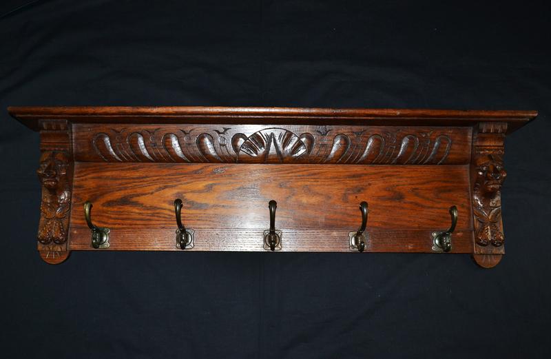 Антикварна дерев'яна вішалка для одягу з п'ятьма подвійними металевими гачками, левовими головами та різзю для дерева. Матеріал: дуб Висота: 30 см. Ширина: 106 см Глибина: 11 см