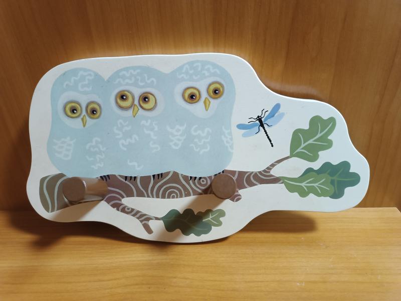 --- 🦉 Детская настенная вешалка IKEA VANDRING - очаровательные совенята Описание: Оригинальная настенная вешалка из коллекции VANDRING от IKEA – это не просто функциональный элемент, а настоящее произведение детского декора. Три милых совеника с большими глазами сидят на ветке среди зеленых листьев, а рядом порхает голубая бабка. Изделие изготовлено из МДФ, имеет два деревянных крючка для одежды, рюкзаков или аксессуаров. Идеально подходит в детскую комнату, добавляя ей уюта и игры. Особенности: - 🎨 Авторский дизайн с природными мотивами - 🪵 Натуральная текстура дерева, приятная на ощупь - 🔩 Удобное настенное крепление (ключиковые отверстия) - 🧒 Подходит для детей – безопасные округлые формы - 🧩 Сочетается с другими элементами серии VANDRING Стан: Отличный, без повреждений. Сохранена оригинальная наклейка IKEA с маркировкой CARB P2 (экологический стандарт). Размеры: Ширина ~30 см, высота ~20 см Цена: 350 грн.