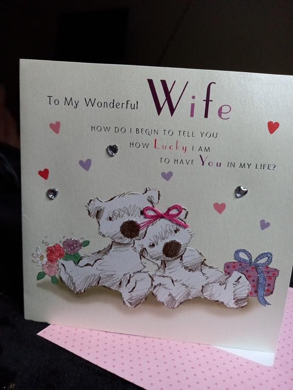 вітальна листівка- книжечка з аплікацією до Дня народження моєї дружини з англійським текстом зверху і всередині " для моєї чарівної дружини я щасливий мати Тебе в своєму житті " "який подарунок я отримав коли Ти стала моєю дружиною" "З Днем народження " розмір 15см х 15см