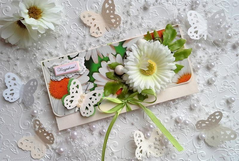 Дуже милий грошовий конверт ручної роботи для подарунка жінці або дівчині. Ніжна метелик пурхає біля красивої ромашки. Цей конверт нікого не залишить байдужим. Розмір 8.5*17 см. Даруйте неповторні подарунки! Напис за бажанням можна поміняти на потрібний.