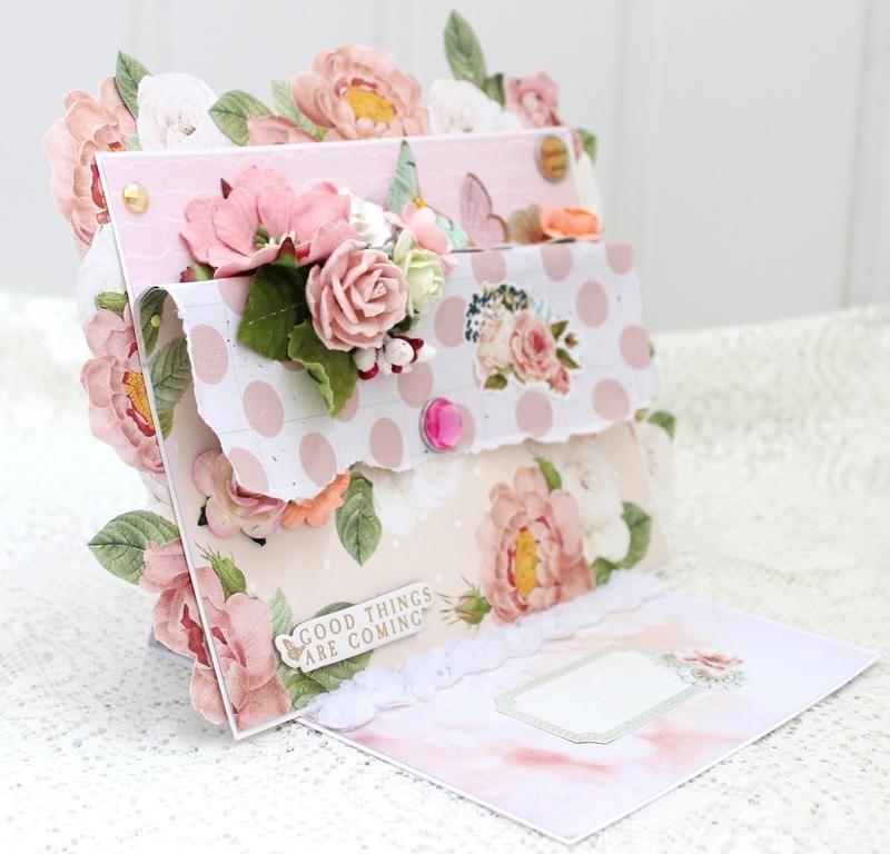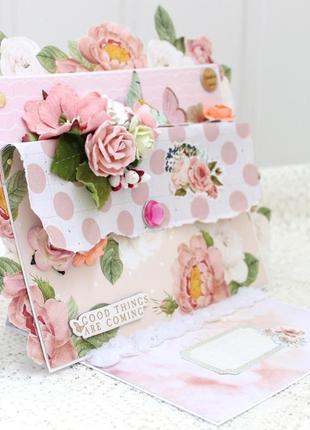 Велика розкладається квіткова листівка ручної роботи з об'ємною квітковою композицією і різними прикрасами. Розмір листівки 17х23.