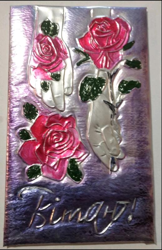Зробить свої вітання оригінальними та незабутніми! Металеві листівки з рельєфним зображенням та використанням кольорових елементів стануть унікальним подарунком для улюбленої жінки, дівчини, мами, бабусі, колеги. Ці листівки додадуть романтичного настрою для близької вам людини, а також будуть чудово виглядати на стіні або холодильнику. Листівки ручної роботи виконані в техніці тиснення на металі, що додає роботі глибини та об'єму. Кожної деталі була приділена велика увага, автор намагався передати баланс між стилем та емоційністю. Зі зворотнього боку на ваш вибір за замовленням- кріплення під цвях або магнітний вініл на всю площу листівки. На зворотньому боці можно написати ваше особисте привітання, якщо ваше замовлення буде без магнітного вінілу. Матеріали: метал (алюміній), який був оброблений для створення рельєфного зображення. Зі зворотного боку листовий пластик. Кольорові елементи: спиртові чорнила, акрил, лак. Розмір 11×18 см. (+-1-2мм). Товщина приблизно 5 мм.. Ціна: за 1шт. без магніту 300 гр.; за 1шт. з магнітом 380 грн.