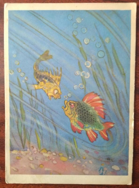 Листівка дитяча. казка / мультик. йорж б'ється з карасем. 1968 р.