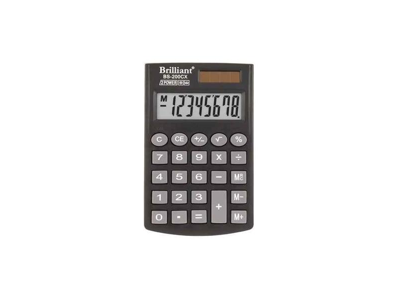 Калькулятор кишеньковий BS-200CX 8р., 2-пит BS-200CX ТМ BRILLIANT Кишеньковий калькулятор BRILLIANT, 8-розрядів (кількість цифр на екрані). однорівнева память гумові клавіши обкладинка PVC захист від залипання клавіш автовимкнення живлення літієва та сонячна батарея живлення розміри: 62х98х10 мм, вага: 36 г гарантія: 1 рік