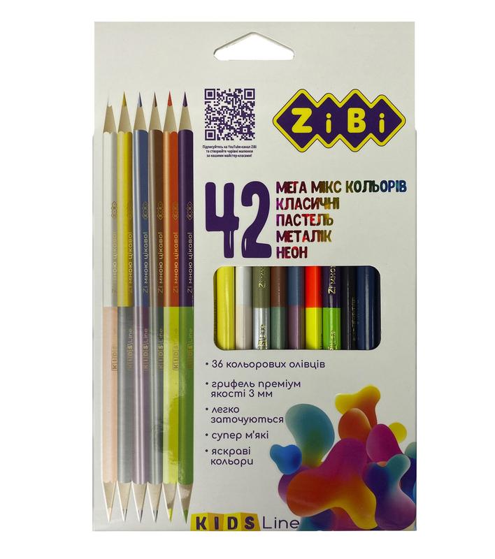 Карандаши цветные zibi 42 цвета (30 стандарт, 6 двухстронних), трехгранные, zb.2443