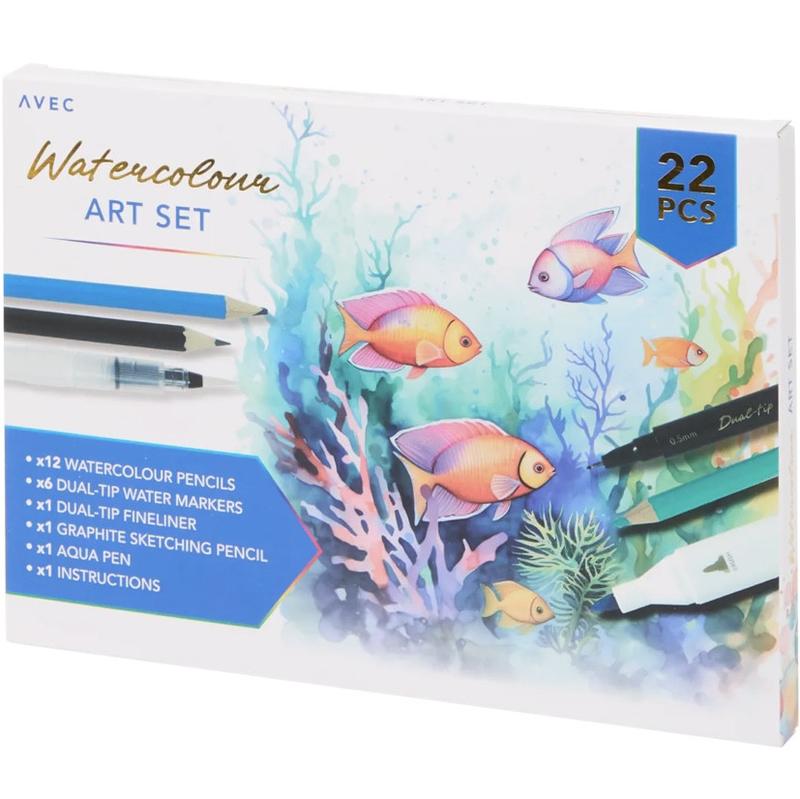 Акварельний художній набір 22 передмети Вміст: • 12 акварельних олівців • 6 водяних маркерів з подвійним наконечником • 1 тонкий лайнер з подвійним наконечником • 1 графітовий олівець для малювання • Пензлики з резервуаром для води • Інструкція Багато годин веселого малювання