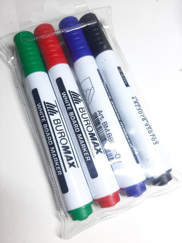 Набір маркерів - Важливий предмет у кожній школі, університеті і навіть на роботі. Саме їх призначено для білих досок і фліпчатів. Пакування: 4 шт Наконечник - кулястий Пишучий вузол 4 мм Пакування ПВХ Цвет: червоний, синій, чорний, зелений