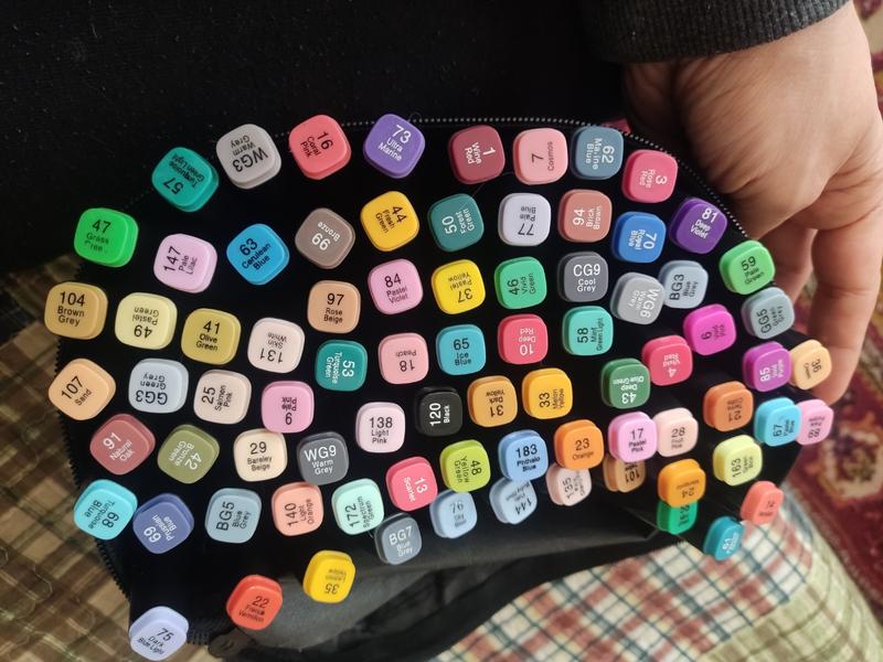 Маркери двосторонні, яскраві кольори. з одного боку товстий стрижень з іншого тонкий. Нові, трохи порвана сумочка, в якій вони зберігаються.