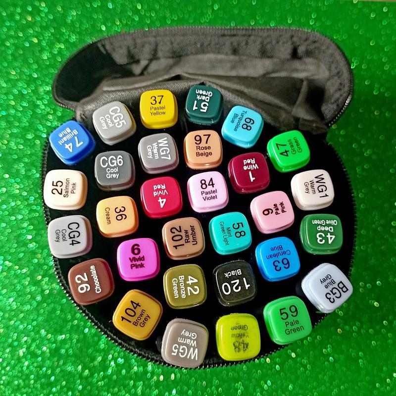 Набір двосторонніх скетч-маркерів 12 кольорів, запаковані в сумку на блискавці. Маркери з одного боку у формі клина, з іншого - як звичайний фломастер. Скетч-маркери на спиртовій основі швидко сохнут та на розмазуються при малюванні. Фарба, яка використовується в маркерах, дозволяє змішувати кольору і малювати плавні переходи, домагаючись нових відтінків, швидко сохне та на розмазуються при малюванні. Відмінною особливістю цих маркерів є можливість їх заправки, це дозволить продовжити термін служби маркерів. Прямі поставки з заводу дозволяють встановити низьку ціну при високій якості.