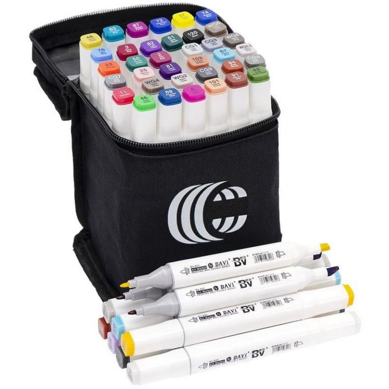 Набор скетч-маркеров Набор двусторонних фломастеров / скетч маркеров на спиртовой основе. В наборе 36 штуки в сумке. С одной стороны обычный фломастер, с другой стороны скошенный маркер. Каждый цвет имеет свой цифровой код, который нанесен на колпачок маркера. Колпочки плотно закрывают маркер, препятствуя высыханию. Чернила на спиртовой основе хорошо впитываются в бумагу, поэтому рекомендуется использовать плотные листы или картон. Размер бокса см 10х12х20