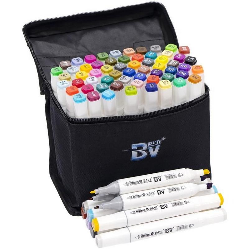 Набір двосторонніх фломастерів / скетч маркерів на спиртовій основі. У наборі 60 штук у сумці. З одного боку звичайний фломастер, з іншого боку скошений маркер. Кожен колір має свій цифровий код, який нанесений на ковпачок маркера. Ковпачки щільно закривають маркер, перешкоджаючи висиханню. Чорнило на спиртовій основі добре вбирається в папір, тому рекомендується використовувати щільні аркуші або картон.