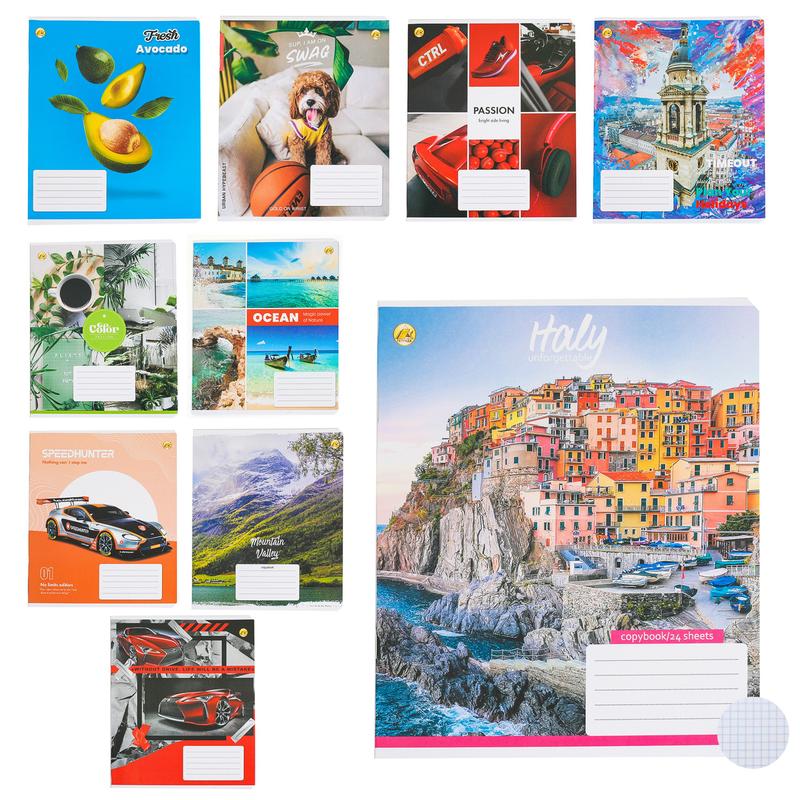 Зошит "МІКС Люкс", кольорова обкладинка. 24 аркуші в клітинку. Упаковка - плівка, 20 шт. Ціна за упаковку.