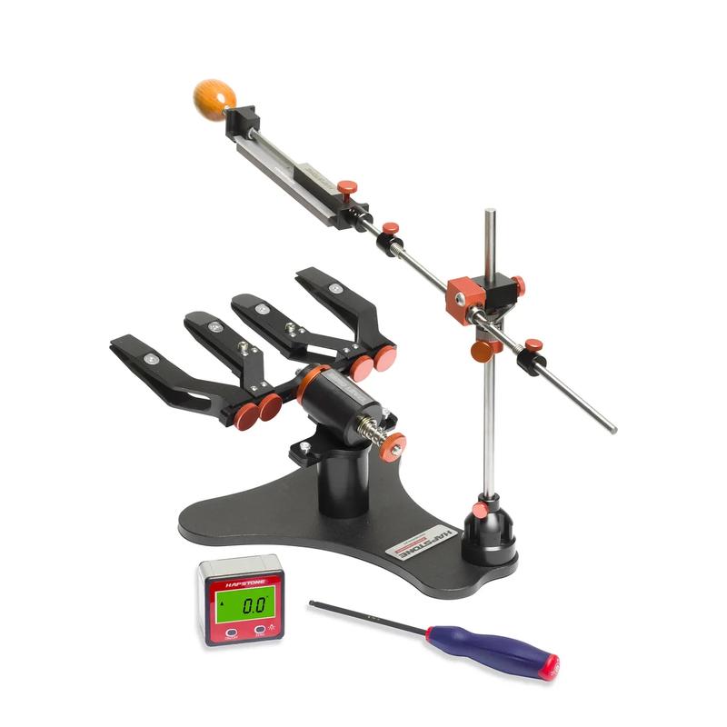 Точильні системи Hapstone розроблялися для того, щоб забезпечити максимально точне заточування різальної кромки будь-якого ножа, незалежно від його розмірів, довжини клинка та виду сталі. Основа системи масивна, сталева, ніжки доповнені гумовими накладками – таким чином пристрій не ковзає по столу під час робочого процесу. Легка горизонтальна штанга несе на собі універсальний тримач каменів та місце для монтажу цифрового кутоміра, керується вона зручною дерев'яною ручкою. Муфта точного коригування кута обертається дуже плавно. Шарнірний вузол оснащений лінійним підшипником, що мінімізує тертя та забезпечує рівне ковзання штанги. Є гачок для паркування. Система дуже варіативна, залежно від моделі, підтримує столик для заточування ножиць, адаптер для лінзоподібної заточки та інші аксесуари. Модель Hapstone R2 випускається у чотирьох версіях: Standart, Lite, Black, Classic. Hapstone R2 Standard оснащена двома асиметричними затискачами, які можна орієнтувати в широкому діапазоні і, таким чином, ефективно заточити як складаний ніж, так і довгий кухонний "шеф". Hapstone R2 Lite – полегшена та спрощена версія «стандарту» з прямими фрезерованими затискачами. Hapstone R2 Black – модифікація точильної системи R2 з двома додатковими суцільнофрезованими затискачами. В універсальних кутових затискачах використовуються гнучка плоска пружина і розпірні ґвинти для фіксації ножів будь-якої форми. Кутові затискачі Hapstone призначені для зміщення точок фіксації ножа відносно осі симетрії поворотного механізму. Наприклад, повернувши затискачі вигином всередину (зсунувши затискачі максимально щільно), можна комфортно заточувати маленькі ножі, а повернувши затискачі назовні, можна обробляти ножі більшої довжини, чим не можуть похвалитись затискачі прямої форми. Таким чином наявність більшої кількості таких затискачів збільшує варіативність та ефективність фіксування ножів майже будь-якого розміру. В своїй конструкції затискачі мають пружинно-ресорні вставки зі сталі 65Г та додатковим розпірним ґвинтом.