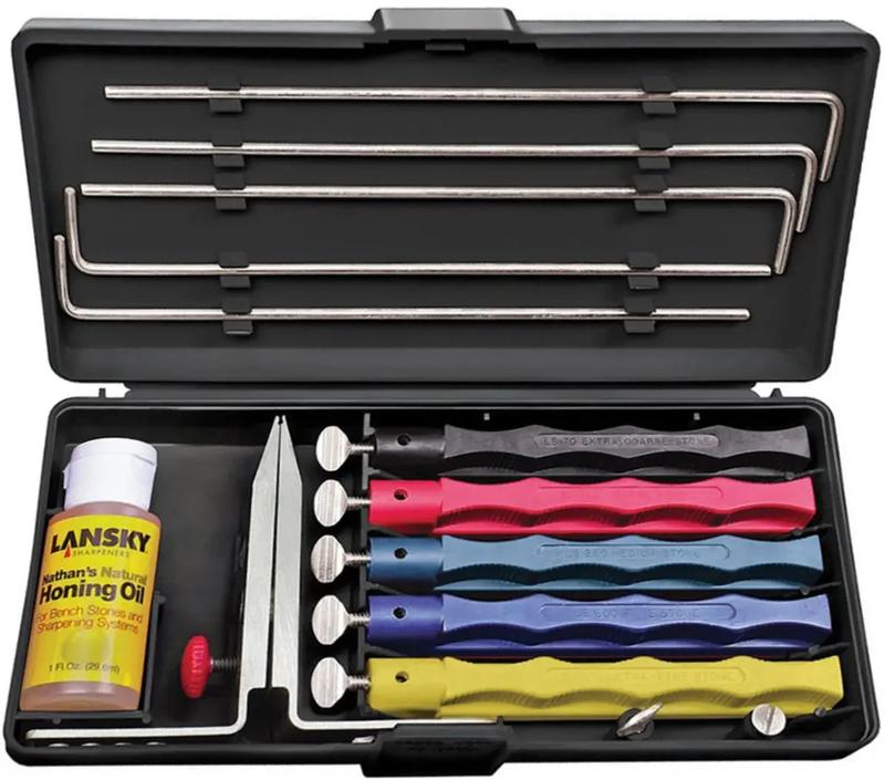 Безопасная, простая и эфективная технология заточки ножей. Система Lansky с контролируемым углом затачивания спроектирована так, чтобы сделать лезвие острым, как бритва. Каждый кейс Lansky Sharpening System включает запатентованный зажим для ножа со сменным углом затачивания, точильные камни с рукоятками, цвет которых обозначает зернистость камня, направляющие для каждого точильного камня и специальное масло для камней, позволяющее улучшить результаты затачивания. Дизайн точила позволяет использовать его как правшам, так и левшам. Система Lansky Deluxe Knife Sharpening System имеет зажим со следующими углами заточки: 17 градусов - в основном используется для японских ножей и бритв 20 градусов - стандартный угол для большинства EDC и кухонных ножей. 25 градусов - под этим углом затачивается большинство ножей, требующих долговременной остроты кромки, например, охотничьи и туристические ножи. 30 градусов - ножи, которые используются для тяжелых задач, таких как резка веревки или бушкрафт. Набор включает в себя: - Зажим Lansky; - Четыре направляющих стержня с зернистостью 600, 280, 120 и 70 грит; - Керамический стержень с зернистостью 1000 грит; - Натуральное масло; - Пластиковый футляр; Пластиковый футляр; - Инструкция.