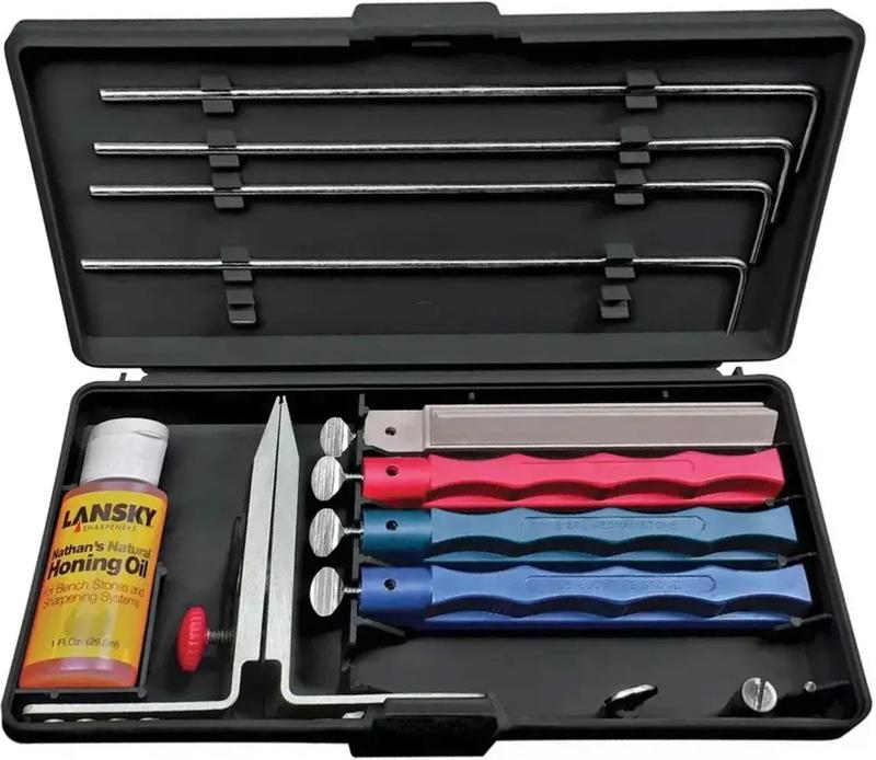 Безпечна, проста і ефективна технологія заточування ножів. Система Lansky з контрольованим кутом заточування спроектована так, щоб зробити лезо гострим, як бритва. Кожен кейс Lansky Sharpening System містить запатентований затиск для ножа зі змінним кутом заточування, точильні камені з рукоятками, колір яких позначає зернистість каменя, напрямні для кожного точильного каменя і спеціальне масло для каменів, що дозволяє поліпшити результати заточування. Дизайн точила дозволяє використовувати його як правшам, так і шульгам. Система Lansky Universal Knife Sharpening System має затискач з наступними кутами заточування: 17 градусів - в основному використовується для японських ножів і бритв 20 градусів - стандартний кут для більшості EDC та кухонних ножів. 25 градусів - під цим кутом заточується більшість ножів, які потребують довготривалої гостроти крайки, наприклад, мисливські та туристичні ножі. 30 градусів - ножі, які використовуються для важких завдань, таких як різання мотузки або бушкрафт. Набір включає в себе: - Затискач Lansky; - Три напрямні стрижні з зернистістю 600, 280, 120 грит; - Напрямний стрижень з трикутним каменем для заточки серейторних клинків; - Натуральна олія; - Пластиковий футляр; - Інструкція.