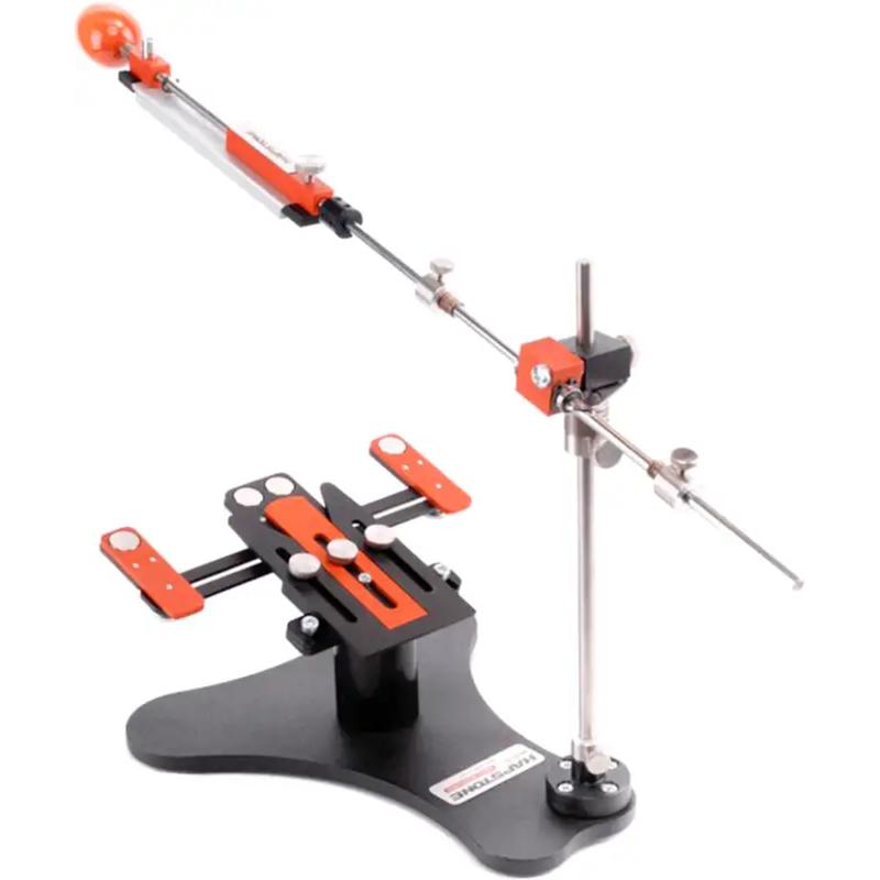Точильна система Hapstone V8 Black Точильні системи Hapstone розроблялися для того, щоб забезпечити максимально точне заточування різальної кромки будь-якого ножа, незалежно від його розмірів, довжини клинка та виду сталі. Основа системи масивна, сталева, ніжки доповнені гумовими накладками – таким чином пристрій не ковзає по столу під час робочого процесу. Легка горизонтальна штанга несе на собі універсальний тримач каменів та місце для монтажу цифрового кутоміра, керується вона зручною дерев'яною ручкою. Муфта точного коригування кута обертається дуже плавно. Шарнірний вузол оснащений лінійним підшипником, що мінімізує тертя та забезпечує рівне ковзання штанги. Є гачок для паркування. Система дуже варіативна, залежно від моделі, підтримує столик для заточування ножиць, адаптер для лінзоподібної заточки та інші аксесуари. Точильна система Hapstone V8 є високотехнологічним пристроєм з масою налаштувань для заточування всіх видів ножів. Основні переваги цієї моделі: - Столик для ножа з регулюванням затискачів під довгі, у тому числі кухонні ножі. - Три упори на столику дозволяють точно та надійно позиціонувати ніж. Модифікація Hapstone V8 BLACK – покращена версія точильної системи V8 з більшою кількістю корисних аксесуарів. Головною перевагою точилки V8 є розширювальний столик, що допомагає заточувати довгі ножі без їх переміщення. Триточковий упор дозволяє точно позиціонувати ніж при перевороті. З-поміж додаткових аксесуарів в наборі Hapstone V8 BLACK є муфта регулювання кута, стопорні кільця, кутомір та викрутка.