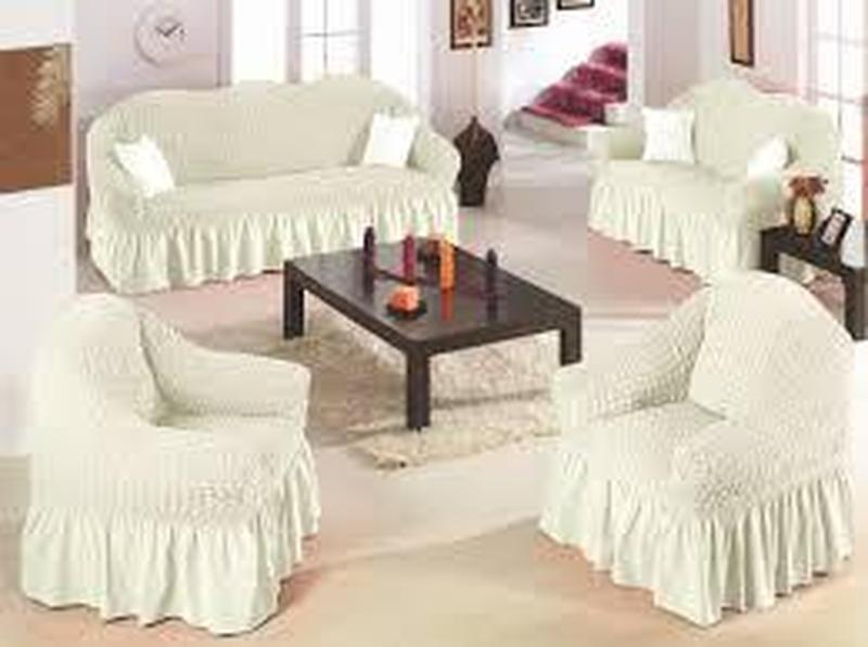 Натяжные чехлы с рюшем на большой и маленький диван и 2 кресла venera молочные
