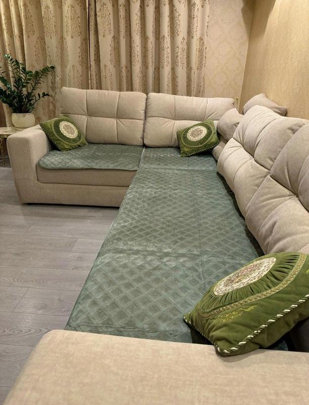 Набір накидок складається з 3 виробів: 90х160 см — 2 шт. 90х210 см — 1 шт. Матеріал: велюр, поліестер. Виворітна сторона прогумована, не ковзає. Можна використовувати як: комплект покривал для дивана та двох крісел. Набір накидок для дивана, крісла та ще м'який килимок. Комплект дивандек для кутового дивана та крісла. Накидки на диван мають протиковзання покриття зі зворотного боку, що дає змогу легко використовувати як покривала на шкіряний диван.