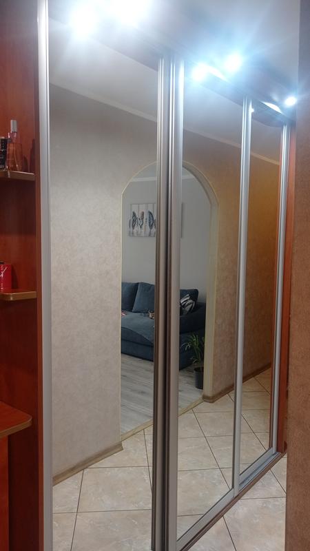 Прихожа з шафою купе 3-х дверна дзеркальна. Вмісткий комод з великим дзеркалом. Середина шафи продумана ідеально зручно. 1 відділення має трубу під верхній одяг і 3 полички, 2 відділення розраховане на 2 труби і 1 поличку, 3 відділення має 7 вмістких шухляд та 3 полички. В гарному стані. Висота комоду 100см, ширина 100см, дзеркало 94*90. Купе 2.30*2,45*60