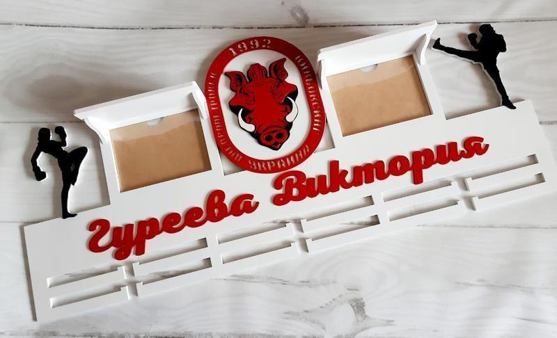 Медальница из дерева "Кикбоксинг" с полкой и фоторамками.(супер большая) StudioN делает медальницы любой сложности,все ваши пожелания учитываются. У каждого логотипа есть свои нюансы, многоцветие и сложности наложения,и от этого исходит и разница в цене, каждую медальницу просчитываю отдельно по макету. Медальница Размеры , длина 100 см , с уникальным текстом, с полкой для кубков, и фоторамками 13х18 см - 2 шт. Изготовлена из фанеры толщиной 8 мм. Это просто шедевр изготовленный из дерева, способом лазерной резки , и окрашена акриловыми красками. Можно изготовить для любого вида спорта. Ваши медали всегда в порядке. материал - дерево размер можно делать любой под заказ силуэты спортсменов меняются в зависимости от пожеланий клиента цена указана за покраску как на фото (цвет можно выбирать) при изменении количества цветов цена рассчитывается индивидуально, в зависимости от сложности покраски если что-то кардинально менять в дизайне изделия, то цена рассчитывается индивидуально в зависимости от сложности работы все пожелания указывайте в комментариях к заказу Медальница - це відмінний спосіб зберігання медалей і нагород. Медальницы спортивні виготовлені з дерева, пофарбовані та вкриті лаком, що не тільки надає зовнішньому вигляду вишуканості, але і сприяє довговічності і практичності у використанні. Додаткові характеристики: Призначення: Для медалей Матеріал: Фанера Тип: Настінна Товар виготовляється на замовлення
