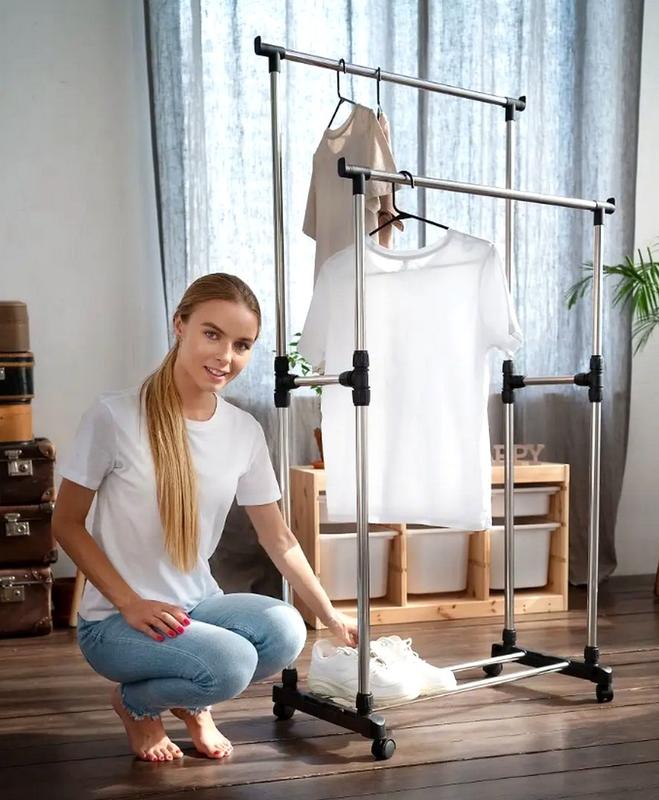 Підставка вішака для одягу, стійки для одягу підлогові для дому, Вішалка для одягу стояча, NST Розміщення речей у квартирі, а особливо у квартирі невеликого розміру, справа непроста, є всього кілька варіантів, за яких кількість вільного місця залишається більшою — це або вбудована шафа на всю стіну, або пересувна стійка для одягу. Представляємо Вам зручний і вигідний спосіб розміщення якщо не всіх то необхідних речей Зручна та досить велика стійка для одягу має в розмірах (середніх) — 160х75х42 см, і це не межа. Стійка повністю збірна, і її можна подовжити та зробити вищою, або ж зробити вже або нижче. Оскільки стійка повністю збірна, і до того ж без єдиного болта, гвинта або шурупа, зібрати та розібрати її, за потреби, не становитиме великих труднощів і часу, в середньому на збирання піде не більш ніж 15-20 хвилин (якщо не поспішати). Всі трубки стійки скріплюються за допомогою великих пластикових затискних замків. Трубки стійки виготовлені з алюмінію й покриті захисною фарбою оливкового кольору, порожнисті всередині, тому стійка навіть у складанні важить не більш ніж 1,5 кг. Пластикові заглушки на кінцях труб, зібраної конструкції, захистять одяг і запобігають випадковому падінню одягу, якщо він буде просто накинута на стійку. Великим плюсом стійки є наявність невеликих коліщат, завдяки яким Ви зможете пересунути стійку навіть повністю завіщеним одягом. виготовлена як двоповерховий, для впорядкування та нормального, компактного розміщення одягу на ній. Бічні поперечні планки зручні для розміщення на них, допустимо, випрасованих штанів. Найкраще для стійки використовувати вішалки, так одягу можна розмістити в рази більше. Переваги: - Досить габаритна, для розміщення більшої кількості одягу; - Компактна, завглибшки, для збереження простору; - Має легку вагу; - Легке та досить швидке збирання; - Не вимагає використання додаткових інструментів (тільки руки); - Завдяки коліщаткам — легко транспортується навіть завантаженою; - Подвійна стійка; - Поперечні невеликі перекладини; - У нижній частині стійки — невелика пілочка для взуття; - Пластикові заглушки на труби. Комплектація - 6 великих труб діаметром 25 мм; - 4 середніх труб, діаметром 22 мм; - 2 малих труби, діаметром 19 мм; - 6 маленьких коротких трубочок діаметром 22 мм; - 2 ніжки-стійки (пластикові); - 4 колеса (кріпляться по-бажанню); - 8 Т-подібних кріплень; - 4 заглушки; - Картонна коробка для перенесення та зберігання Габаритні розміри: - Ширина: 75 см. - Глибина: 42 см. - Висота: 160 см. - Вага: 3.5 кг.
