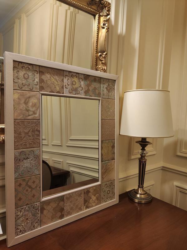 зеркало состоит из деревянной рамы и расписаных в ручную керамических плиточек. По Вашему желанию могут быть любые цвета, узоры и размер - от маленького зеркала до зеркала в пол. Каждый заказ индивидуален и не повторяеться. Товар под заказ