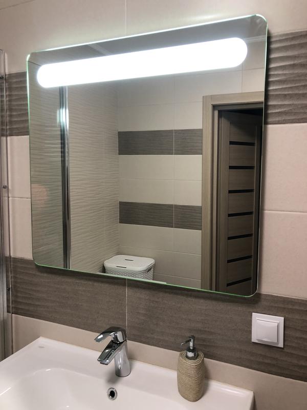 Зеркало в рабочем состоянии, без дефектов. Подсветка работает. Включаться на кнопку. Висота 75 см, ширина 80 см.