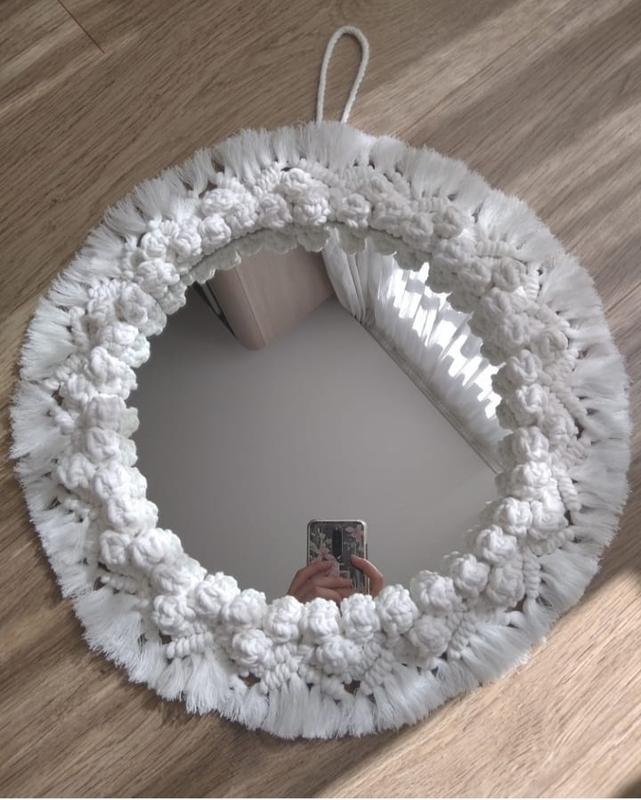 Дзеркало в техніці макраме, красива і стильна деталь інтер'єру. Зробить ваш будинок ще затишніше. 100% бавовна Колір - пломбір Діаметр дзеркала - 27см, повністю - 40см. Приймаю індивідуальні замовлення