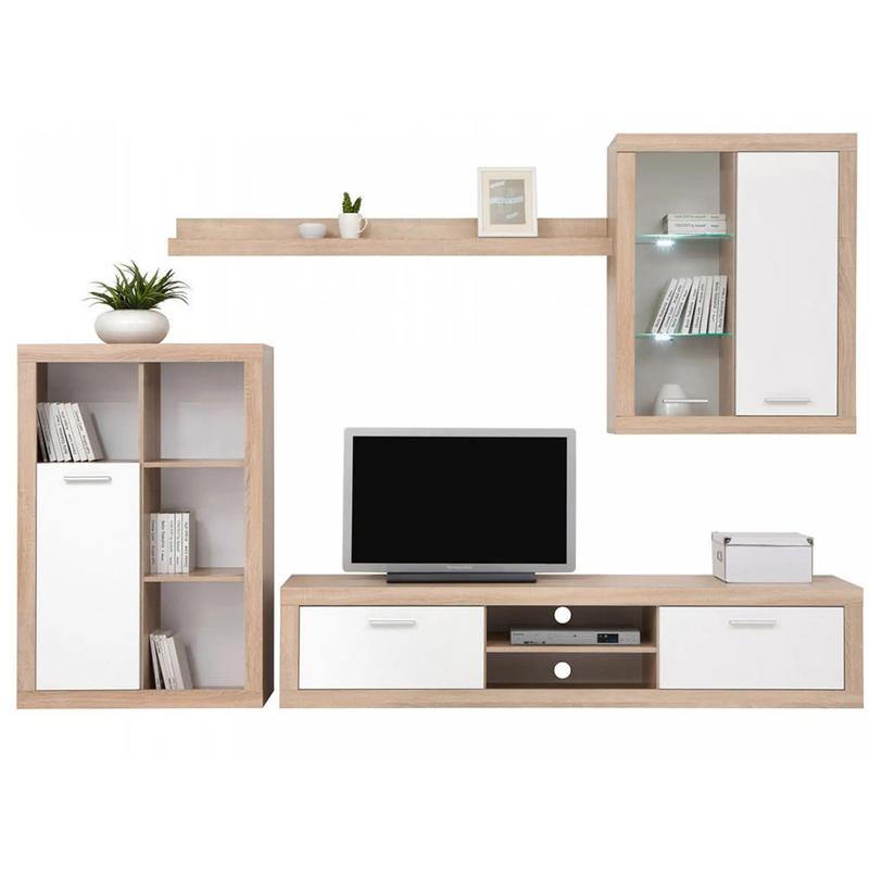 Модульна стінка для вітальні з підсвіткою ВМК (БРВ) Сансет Дуб сонома + Німфея альба Елегантна вітальня "Сансет" від українського виробника ВМК (БРВ) чудово доповнить будь-який інтер'єр. Кольорове рішення в стилі "Дуб сонома/білий" та "Бетон/білий" створює відчуття простоти та стилю. Матеріал корпусу та фасаду - високоміцне ДСП, яке ніколи не втратить свого первісного вигляду та здивує вас своєю стійкістю та довговічністю. У комплект входить LED підсвітка для вітрин, що додає затишку та захоплюючих світлових акцентів у ваш дім. Розміри загальні: Довжина - 270 см; Глубина - 40 см; Висота - 200 см. Стінка складається з модулів: Стелаж REG1DO - 1 шт. Чотири відкриті відділення, одні двері, всередині одна полиця. Довжина: 80 см Висота: 120 см Глубина: 34 см Тумба ТВ RTV2K - 1 шт. Два відкритих відділення, двоє відкидних дверей, максимальне навантаження на стільницю 20 кг. Довжина: 190 см Висота: 41 см Глубина: 40 см Вітрина навісна SFW1W1DP - 1 шт. Двоє дверей (ліві - зі скляною вставкою), всередині - три полиці (дві - скляні). Довжина: 80 см Висота: 100 см Глубина: 30 см Полиця POL150 - 1 шт. Максимальне навантаження на полицю 5 кг. Довжина: 150 см Висота: 11 см Глубина: 20 см