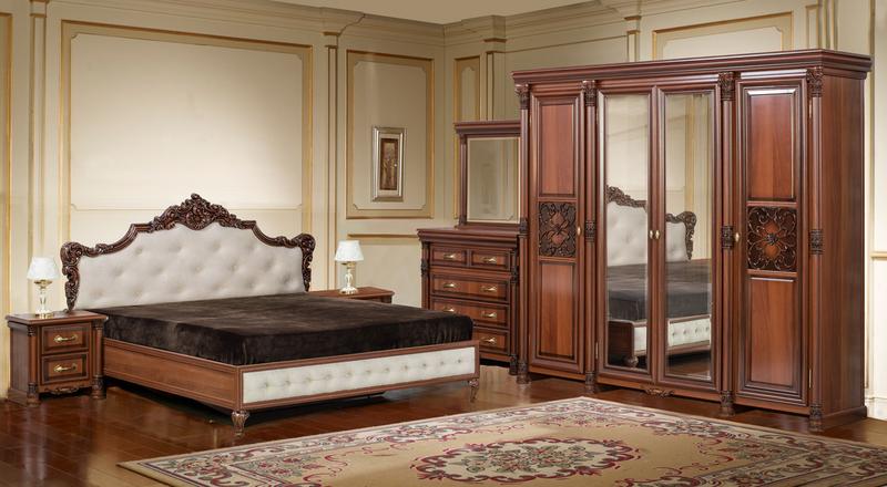 Комплект спальні з 4-х дв. шафою ЛАКОВАНІ Фасади, Патинована Корпус ДСП: горіх патинований / лакований: горіх Шафа 4-х дверний: 2,27х2,21х0,59м Комод 1,0х0,9х0,44м Дзеркало в рамі: 1,1х0,65м Ліжк**********м Тумба: 0,55х0,46х0,37м