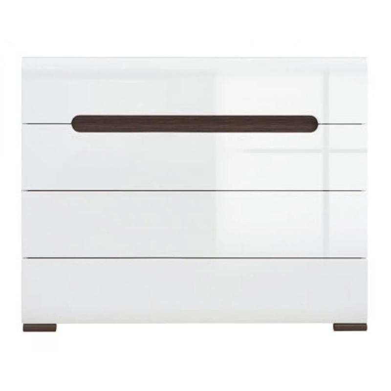 Комод у вітальню ВМК (БРВ) Ацтека KOM4S/8/11 N (телескопи) Білий + Білий глянець Комод Ацтека KOM4S/8/11 N від відомого українського виробника ВМК (БРВ) є відмінним вибором для оформлення вашої спальні або вітальні. Модель виконана в сучасній стилістиці і поєднує в собі функціональність і стиль. Благородна сатиново-біла гамма поєднується з розкішним глянцевим білим кольором, надаючи моделі трендову лаконічність і витонченість. Комод має зручні габарити: довжина становить 105 см, глибина - 41 см, а висота - 84 см. Всього в комоді передбачено 4 висувних ящика, оснащених телескопічними направляючими повного висування, що забезпечує зручність користування і тривалу службу. Якість даної меблі підтверджено вибором матеріалів: корпус виконаний з ДСП, а фасад - МДФ. Це гарантує високу міцність і довговічність комода, що дозволяє йому зберігати первісний вигляд навіть при інтенсивній експлуатації. Характеристики: Висота: 84 см; Глибина: 41 см; Довжина: 105 см.