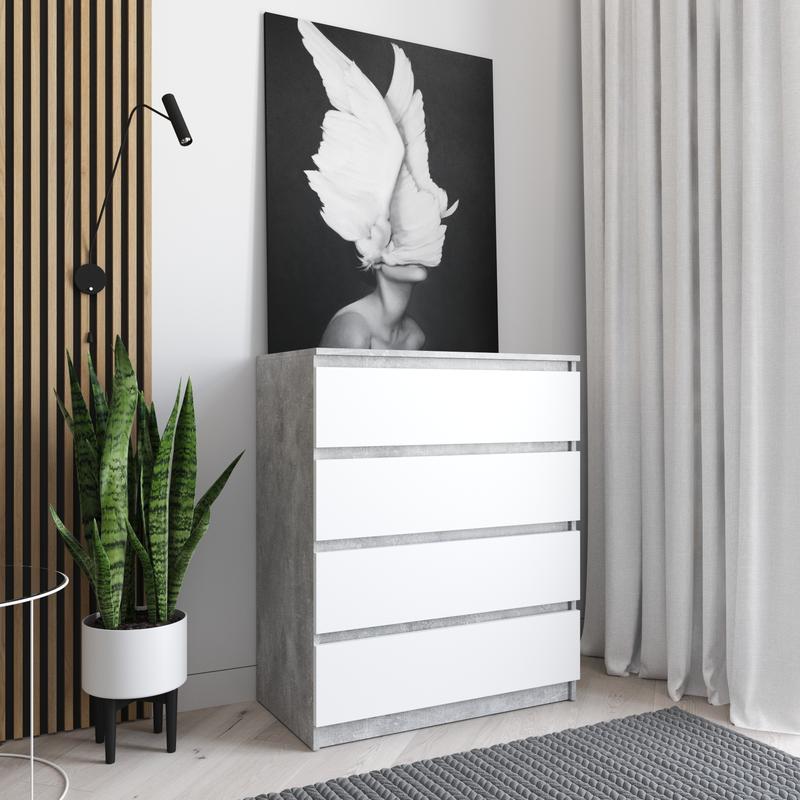 Комод на 4 шухляди R - 4 Власне виробництво Матеріал: ламінова ДСП, товщина 16 мм Розміри: Ширина: 802 мм Висота: 980 мм Глибина: 400 мм Кольори: Білий Дуб сонома Бетон Венго темний Антрацит Бетон + білий Дуб сонома + білий Венго темний + білий Антрацит + білий Доставляємо Новою Поштою по всій Україні у розібраному вигляді ( це зменшує ризик пошкоджень та значно знижує вартість доставки) В комплекті є вся необхідна фурнітура та покрокова інструкція по збірці, всі отвори просверлені.