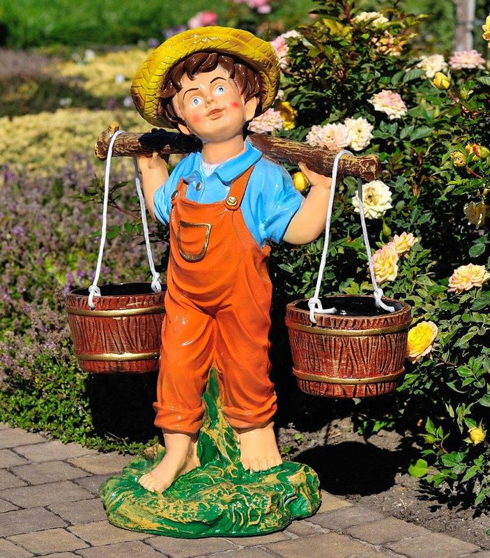 Параметры фигуры - высота 55 см; ширина 37 см; глубина 22 см. Подставка для цветов Водонос изготовлена из качественного материала полистоуна (полимера). - Окрашивается профессиональными художниками с использованием чешских атмосфероустойчивых красок. - В окрас отдельных элементов фигуры могут вноситься изменения, поскольку изделия окрашиваются вручную. - Восприятие цвета изделия может изменятся в зависимости от настроек монитора. - Полистоун не едят птицы, грызуны и насекомые, срок службы более 20 лет. - Подходит для размещения как в помещении так и на улице круглый год (в зимнее время года чашы желательно укрывать для избежания перемерзания воды в подвазоннике). - Фигуры пустотелые, имеют небольшой вес, что облегчает монтаж. - Надежная упаковка при отправлении транспортными компаниями.