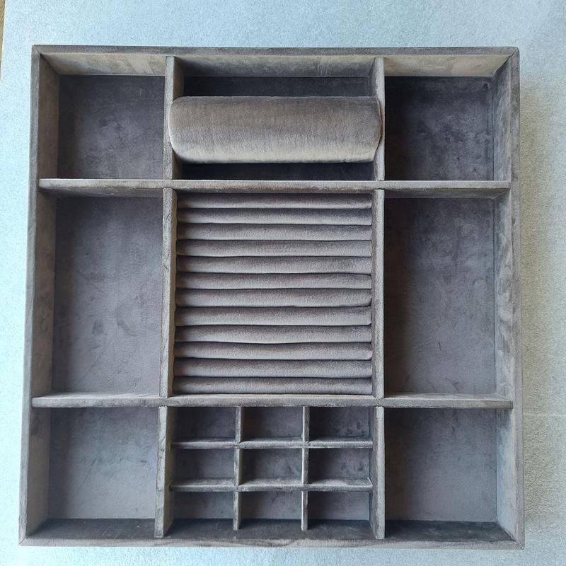 Витончений модуль для прикрас із оксамиту коричневого кольору. Розмір - 467*462*50 мм Тканина - оксамит У модулі передбачені відділи для індивідуального зберігання кілець, сережок, окулярів, браслетів, годинників, підвісок та інших аксесуарів. Внутрішнє наповнення такого модуля, його колір і розмір виготовляється за індивідуальними уподобаннями замовника в ящик столу, комода або в вбиральню. З таким модулем всі прикраси та аксесуари будуть в одному місці, дбайливо зберігатися, не створюючи хаос. Окуляри, сережки, ланцюжки, каблучки, браслети, годинник та інші аксесуари зберігаються в одному місці, тепер підтримувати порядок стане просто. Вартість модуля завжди розраховується індивідуально і залежить від розміру виробу, матеріалу обробки та складності виготовлення. Після узгодження всіх деталей ми складаємо докладний макет вашого майбутнього органайзера. На ньому наочно видно всі осередки та відділи майбутнього виробу. Цей макет також обов'язково узгоджується із замовником. Колір, розмір та наповнення можна вибрати індивідуально. Товар виготовляється на замовлення