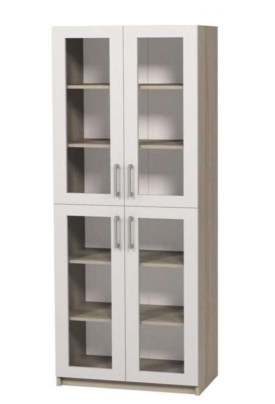 Шкаф 4-х дверный с 4-мя стеклянными дверцами и полками Габаритные размеры: 702х405х2115 мм. Вес: 70,36 кг. Шкаф изготавливается из ламинированной ДСП толщиной 18 мм. Фасад оклеивается кромочной лентой ПВХ толщиной 1 мм, другие части оклеиваются кромочной лентой ПВХ толщиной 0,5 мм. Задняя стенка изготавливается из белой односторонней ХДФ толщиной 2,5 мм. Шкаф имеет 6 закрытых полок. Предусмотрена регулировка отдельных полок по высоте. Фасады шкафа укомплектованы прозрачным стеклом толщиной 4 мм. Шкаф устанавливается на металлические опоры, регулируемые по высоте от 0 до 30 мм, позволяющие ровно выставить его на неровном полу. Цвет ДСП: бук артизан перламутровый, бук, дуб молочный, серый. Цвет ДСП: