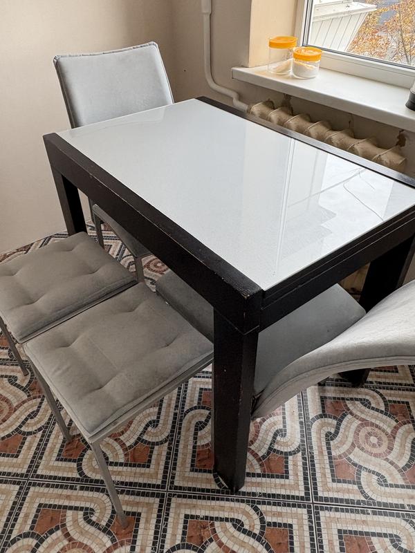 Продам стіл розмір 60*90 (у розкладному вигляді 60*180), 2 стула +2 табуретки з мʼякою оббивкою. З недоліків - тріщина на склі в куті (можна буде замінити нижнє скло на верхнє) , деякі частини на дереві підфарбовувати. Самовивіз: Київ, пр-т Воскресенський, Авторинок.